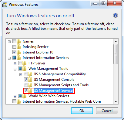 - Expand Internet Information Services and then Web Management Tools and select the feature IIS Management Service.