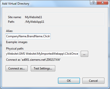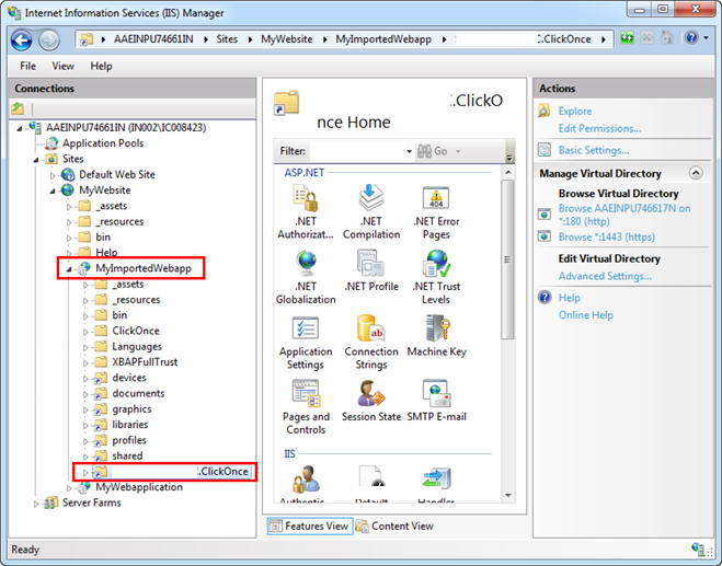 - The ClickOnce virtual directory is added under the web application node in IIS.