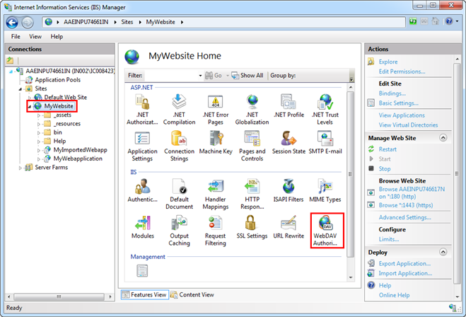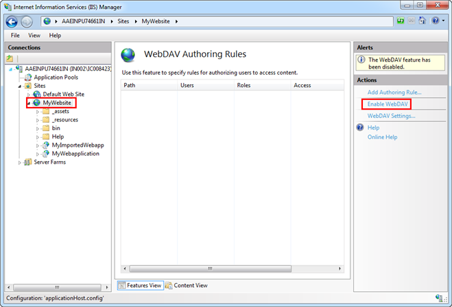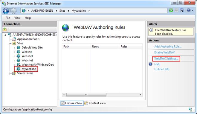 - Select Sites > [Website node] for which you want to enable the WebDAV Authoring Rules and double-click WebDAV Authoring Rules.