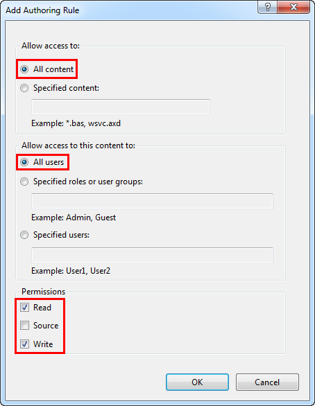d. In the Permissions section of the Authoring Rules dialog box, select the exact permissions, Read, Source, and Write.