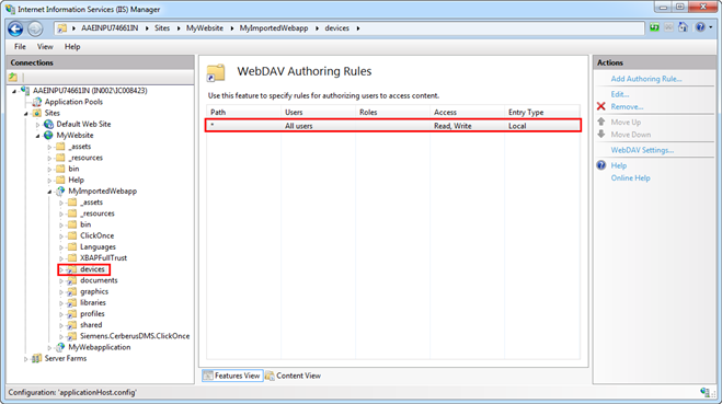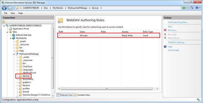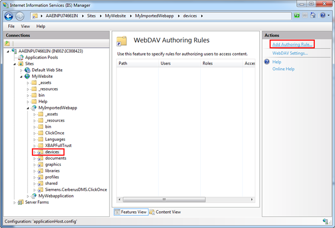 - The WebDAV Authoring Rule entries are added successfully for all the virtual directories, including ClickOnce.