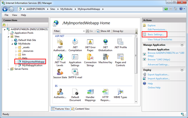 - To verify the Application Pool .Net Framework Version, go to the Connections pane on the source machine and select the web application that you want to export, and from the Actions pane select Basic Settings.