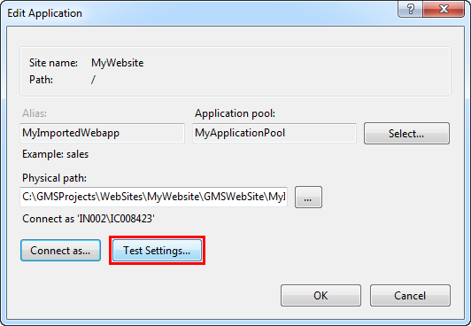 - In the Add Virtual Directory dialog box, click Test Settings to open the Test Connection dialog box.