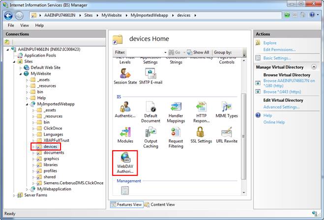 - You have successfully imported the web application in IIS, created the devices, documents, graphics, libraries, profiles and shared virtual directories.