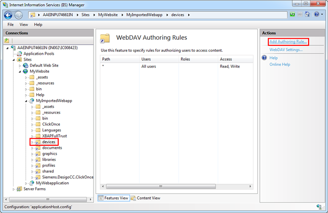 - Select Sites > [website] for which you want to enable the WebDAV Authoring Rules and double-click WebDAV Authoring Rules.