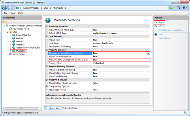 - Set the Web DAV Settings from the Actions pane and set the Properties behavior to True.