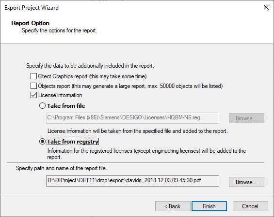 The Migration package option modifies the export package to meet your requirements for migrating a project to the Desigo CC management platform.