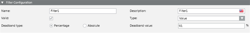 You assign the filter group to a property in the Object Configurator tab, the COVs of that property are logged into the HDB based on the filter group associated with that property. The filter group configuration can be based on either percentage value or the absolute value. Only the COVs of the property, that fall in the filtering criteria of the configured absolute/percentage value, are logged into the HDB. Otherwise, it is ignored and not logged in the HDB.
