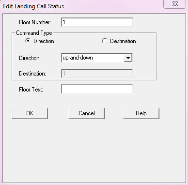 The Edit Landing Call Status dialog box allows you to edit the status of the landing call by specifying the floor number and command type.