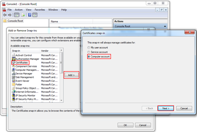 Do the following to add the Certificates in the Add or Remove Snap-ins dialog box: