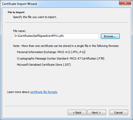 In the Certificate Import Wizard dialog box, browse the certificate file to be imported. Click Next. NOTE: When browsing the pfx file in the Open dialog box, make sure you have selected All Files (*.*) as file type.