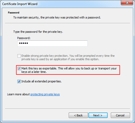 Select the Mark key as exportable check box for self-signed certificate pfx file import. This allows you to back up or transport your keys at a later time.