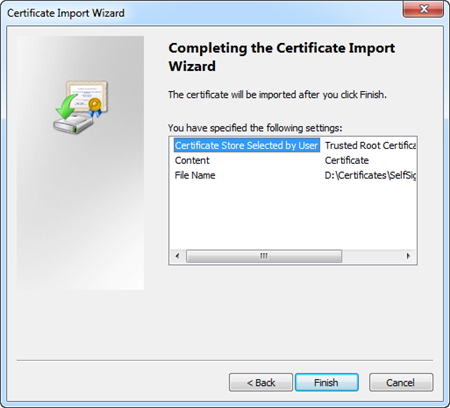 The selected certificate (root or self-signed) is imported successfully to the selected store.