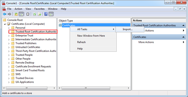 Next, in MMC, you need to import a .pfx certificate (root/self-signed). For this, in the MMC Console tree, select Certificates > Trusted Root Certification Authorities for importing the root and self-signed certificate.