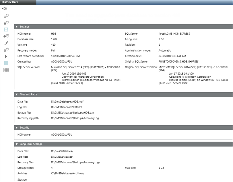 - The History Database is created and displays in the SMC tree. This may take a few minutes depending on the selected database size. When you create a new HDB it gets automatically linked to the SQL Server.