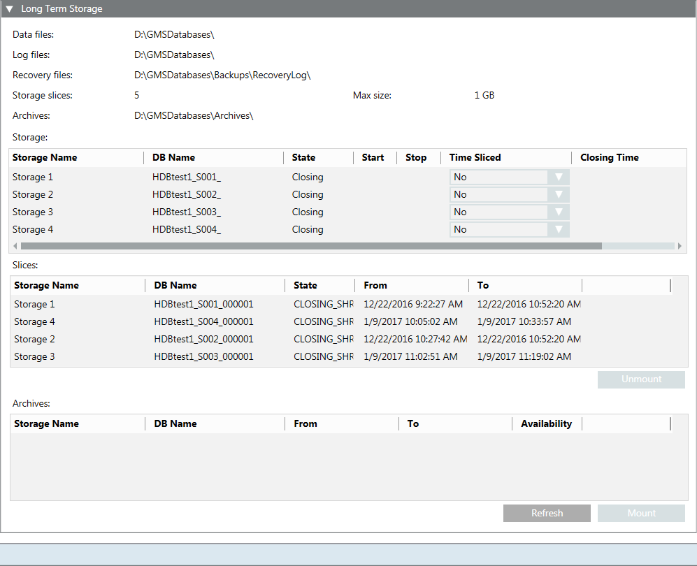 Storage slices | The number of storage slices the long term storage has (max. 10). When this number is reached, the oldest storage slice is archived. NOTE: This number only includes slices in final state. Spare, current or archived slices are included in the number. |