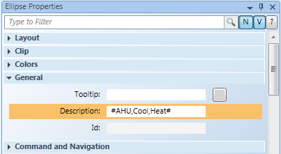Enter a Description to the token name, for example: #AHU# for an individual match or #AHU,Cool,Heat# for multiple matches. NOTE: On grouped objects, the token name must be entered in the properties of the grouped object.