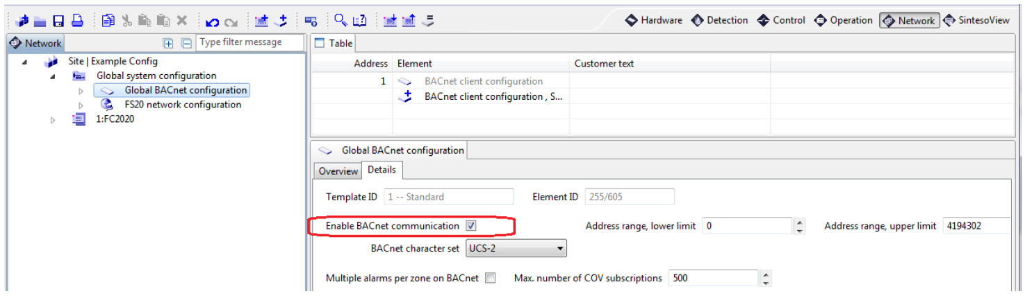 - In Global system configuration > Global BACnet configuration, select the Network > Details tab and select the Enable BACnet communication check box.