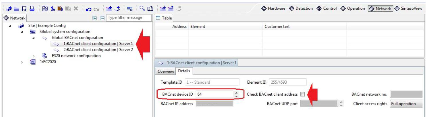 - Under Global BACnet configuration, create the BACnet client that will enable the Desigo CCIn the Details tab of the BACnet client configuration, choose the BACnet device ID to specify in the driver. Do not enable Check BACnet client address.