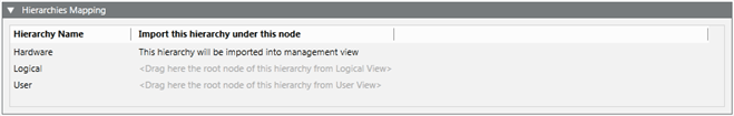 Import this hierarchy under this node | Displays the hierarchy import rule (for example, the Hardware hierarchy was assigned to the Management View). |
