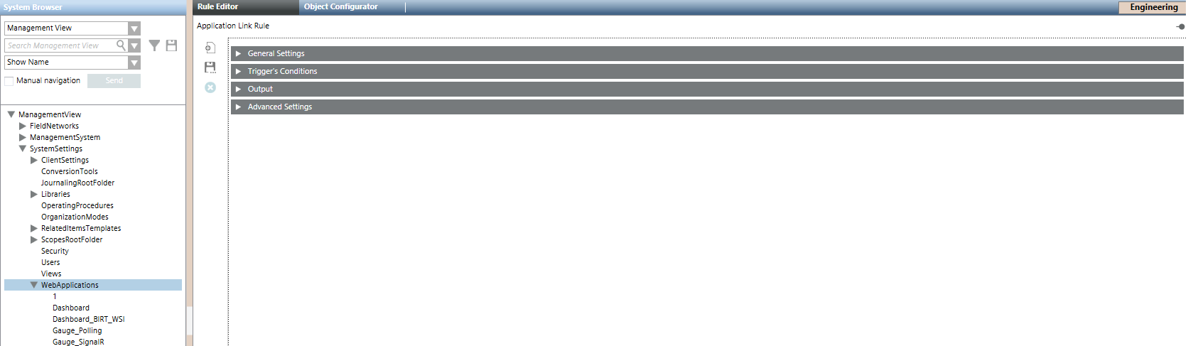 In Engineering mode, when you select a display rule or folder, the Rule Editor toolbar is available in the Primary pane. This allows you to create, save, and delete display rules and folders.