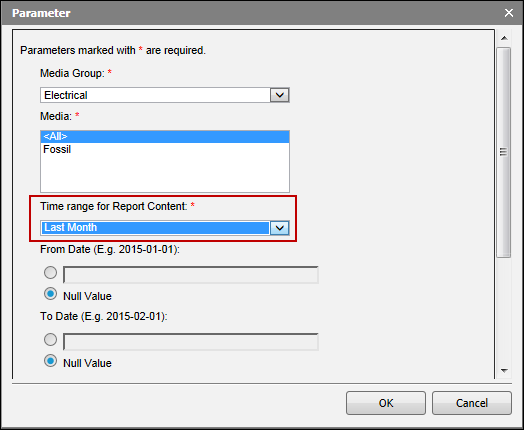 When you select an object in the System Browser that meets the criteria specified in the display rule, the report corresponding to the selected object displays. You can specify the time range for the data to be displayed in the report by specifying the respective values in the Time range for Report Content drop-down list of the Parameter dialog box.
