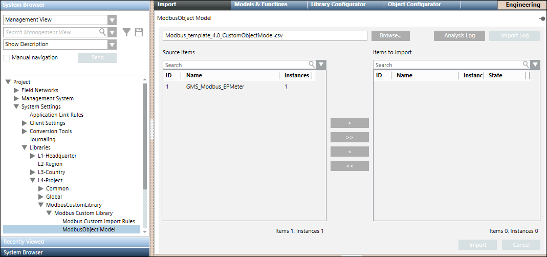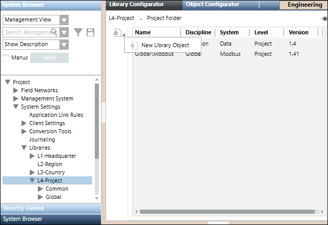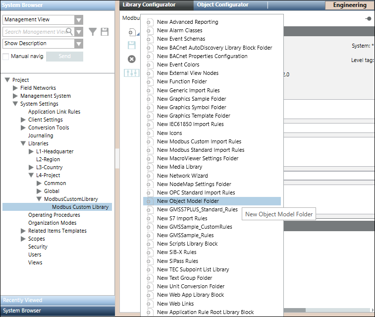 Create an object model folder in it by selecting New Object Model Folder menu option in the list that displays on clicking Add new object. Also, create an import rules folder by selecting the New Modbus Custom Import Rules menu option. For information, see Adding Blocks to a Library.