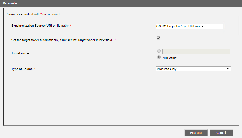 a. In the Synchronization Source (URL or file path) field, enter the path to the libraries folder of your project. For example, [Installation Drive]:\GMSProjects\[Project Name]\libraries.
