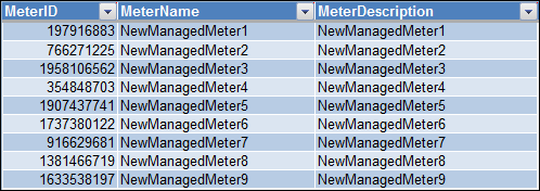 MeterDescription | Description of the managed meter. | You can view the description of the managed meters in your system by 4 – (Optional) Configure Additional Energy Report Parameters in Manually Executing Energy Reports. |
