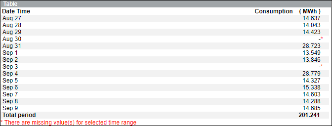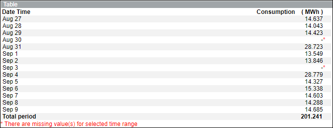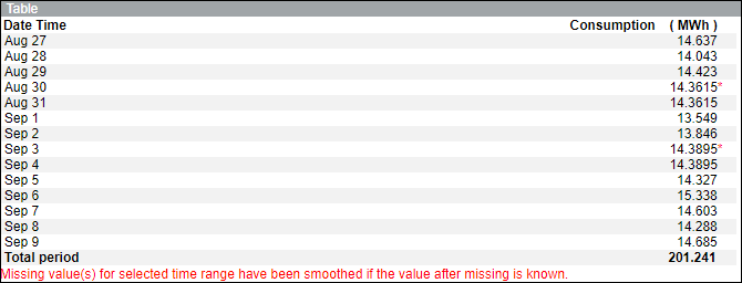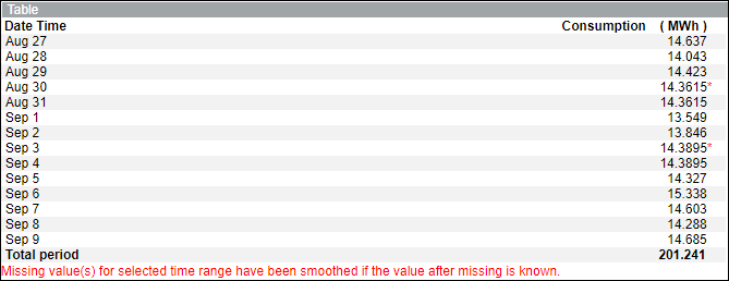 - Displays the average of the consumption value for the missing date with a red asterisk (*).