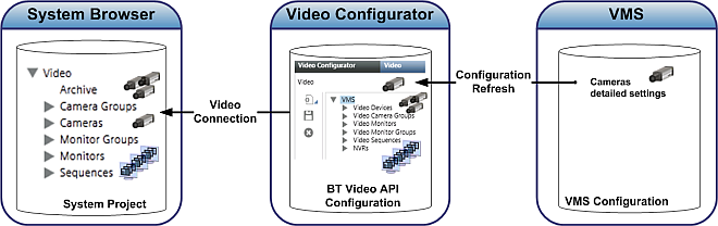 - The management platform connects to the BT Video API to get video images and the configuration information of the Video Configurator tab (which is then used to populate the System Browser tree).