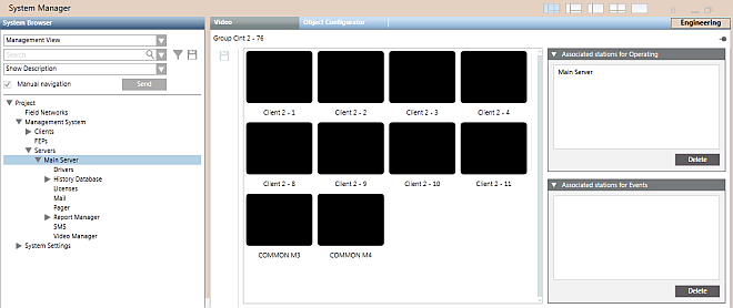 Scenario: To be able to display video, a management station must have an assigned monitor group for operation, that will populate its video view. In addition, to be able to display video during alarm handling, a station must also have an assigned monitor group for events. The Desigo CC server station has two preconfigured monitor groups assigned to it by default. Any other stations need to be manually assigned a monitor group before they can display video.