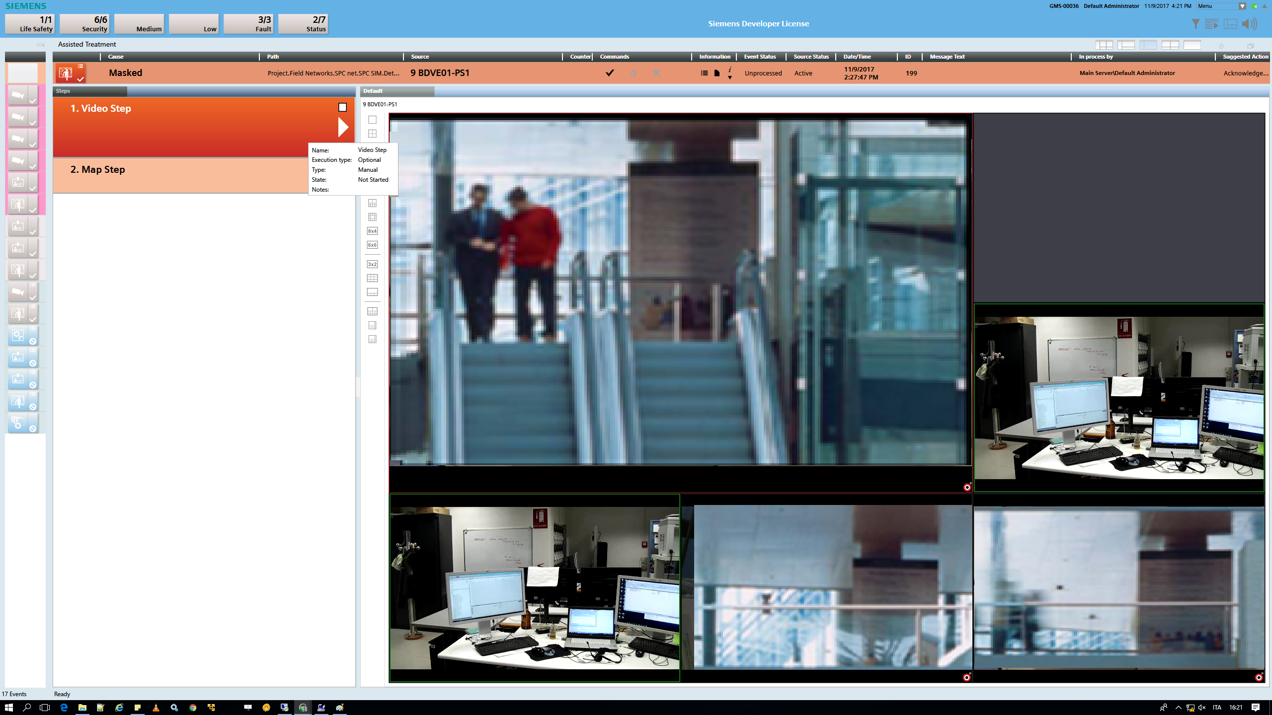 If the procedure includes a Video Step, when you select that step the video view will display a grid of live or automatically-recorded video images relevant to the event, or to the object in alarm.
