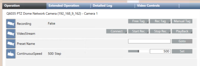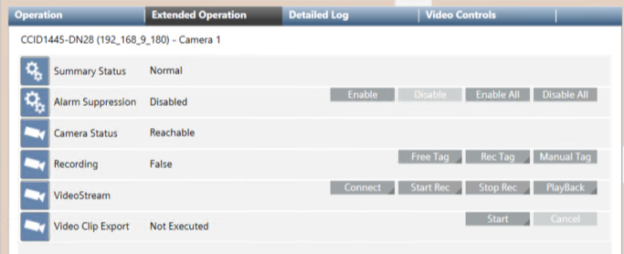 When you select a camera in System Browser or click a monitor in the video view, properties and commands for that camera display in the Operation and Extended Operation tabs.