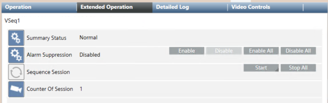 - Stop All, to stop all running sessions of the selected sequence. Note that the number of active sessions is indicated by the Counter of Sessions property in the Extended Operation tab.