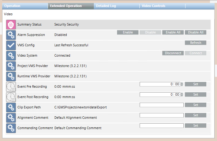 When you select the main Video folder in System Browser, the Extended Operation tab provides you with the connection status and various commands relating to the video system as a whole.