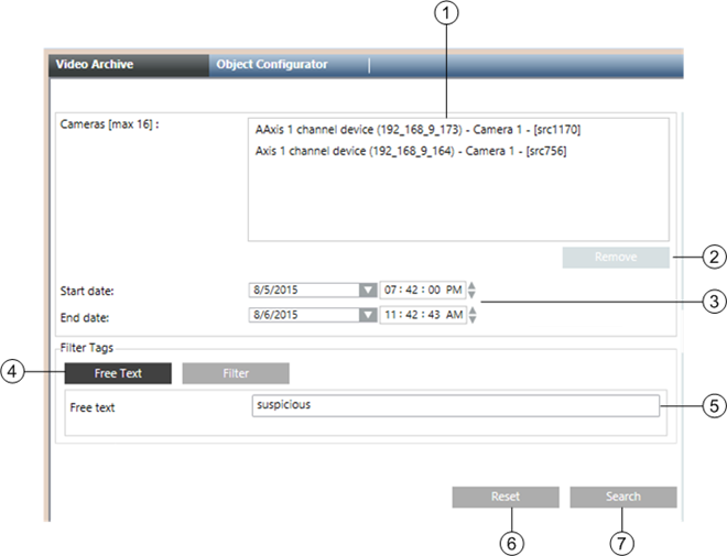 1 | Cameras | Allows for dragging-and-dropping up to 16 cameras, whose recordings will be included in the search |