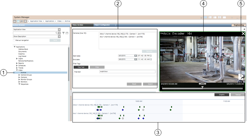 When you select Video > Archive in System Browser, you access the Video Archive tab, from which you can run queries to search for recordings. For step-by-step instructions see Finding Recordings in the Video Archive.