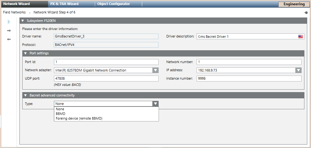 In the BACnet advanced connectivity expander, set the connection Type, which can be: - None (default) - BBMD - Foreign device (remote BBDM) For more information, refer to BBMD and Foreign Device.