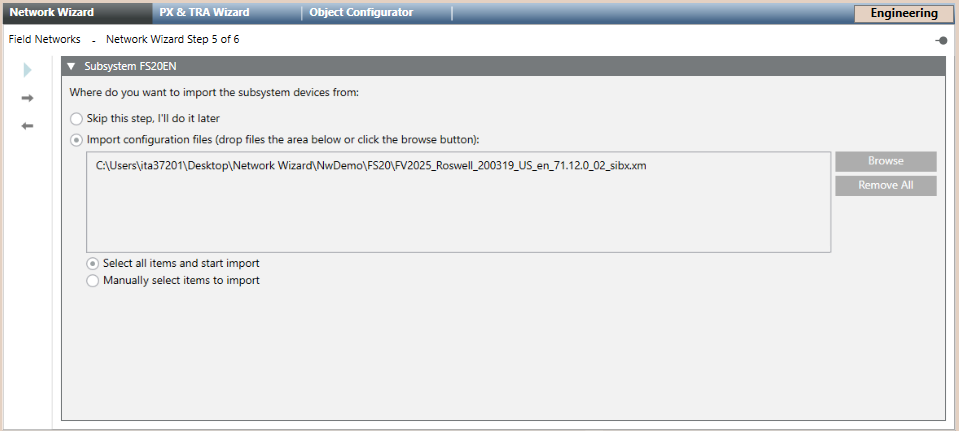After a few seconds, the driver and network nodes appear in System Browser. If the import was selected, information from all panels is imported from the XML file. NOTE: Do not use this wizard to modify any settings. Refer instead to the general configuration procedure.