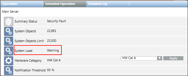 - If the number of S7 PLUS objects is between the system limits (defined by the System Objects Limit property) and the safety threshold (defined by the Notification Threshold property), then the System Load property indicates Warning and displays in the Extended Operation tab.