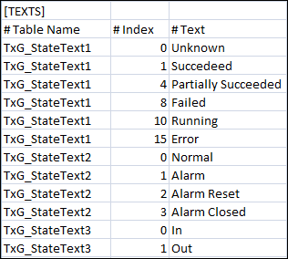 After importing the CSV for such a point, its text group is also added to the list of text groups. The following image displays the Text Group Editor showing the three state texts.
