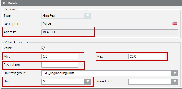 UnitTextGroup | Name of the text group where unit text from the Unit field is defined. If the unit text group is blank, then by default TxG_EngineeringUnits is used. |