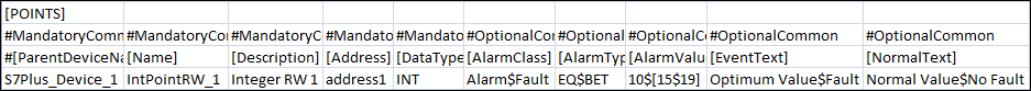 DataType1) | Data type of the S7 PLUS point. For Standard Object Model import, it is a CSV datatype. It is used along with [Direction] to derive the Transformation Type and standard object model of a point using import rules. Valid CSV datatypes include, Bool, Byte, Word, DWord, USint, UInt, UDInt, SInt, Int, DInt, Real, Date, DateTime, Time, TOD, S5Time, String, WString, ENUM. For N to 1 mapping, it is the Transformation Type (datatype of the property on the device). Valid transformation types include, Bool, Byte, Word, DWord, USint, UInt, UDInt, SInt, Int, DInt, Real, Date, DateTime, Time, TOD, S5Time, String, WString. |