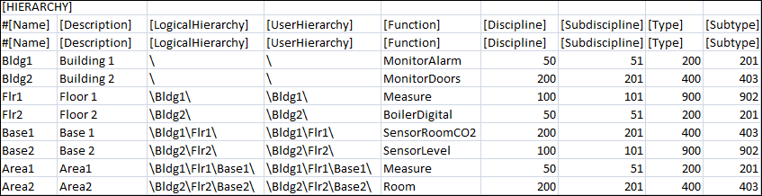 LogicalHierarchy | Logical Hierarchy of the data point in the logical view. The logical hierarchy path in the CSV file must start with a backslash (\). Syntax:[Delimiter]<Level1>[Delimiter]<Level2> [Delimiter]…[Delimiter]<Level-n>[Delimiter]<(Optional) Name Of the datapoint> For example, \BuildingA\Floor3\Room403\Sensor1 The last entry after the backslash (\) represents the name of the datapoint in the logical view. This entry is not mandatory. If the name of the datapoint is not specified in the Logical Hierarchy field, then on import, the name of the datapoint as specified in the Name field displays in the logical hierarchy path of the System Browser. For example, a datapoint with name Light403_11 in the Name field has the following value in the Logical Hierachy field, \BuildingA\Floor3\Room403\. On importing the CSV file, the logical hierarchy path as displayed in the System Browser will be, <Logical Hierarchy Root Node>\BuildingA\Floor3\Room403\Light403_11. This is because in the Logical Hierarchy field, the name of the datapoint is not specified. However, if we change the path in the Logical Hierarchy field to, \BuildingA\Floor3\Room403\Light403, then on importing the CSV file, the logical hierarchy path as displayed in the system browser will be, <Logical Hierarchy Root Node>\BuildingA\Floor3\Room403\Light403. This is because in the Logical Hierarchy field, the name of the datapoint is specified as Light403. |