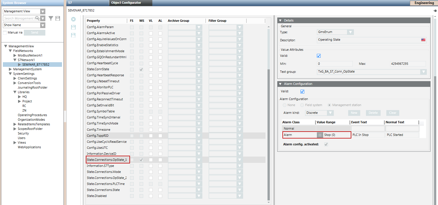 You can configure alarms for S7 PLUS Devices from the State.Connections.OpState_1 property.