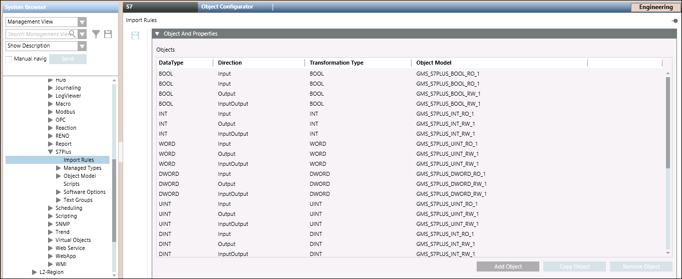 ObjectModel | Object Model of the point. You do not need to specify a value in this field, if you are importing S7 PLUS points using Native Object Models. However, if you are importing S7 PLUS points using N to 1 mapping, you must specify the value of the object model and property. Before specifying a name you must ensure that an object model is defined in the system. For information on creating object models, see Create Object Models |