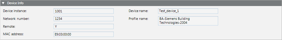 The Device Info expander displays the BACnet device data extracted from the configuration file when it is imported.