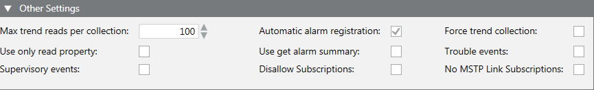The Other Settings expander displays additional default BACnet device settings, which you can modify.
